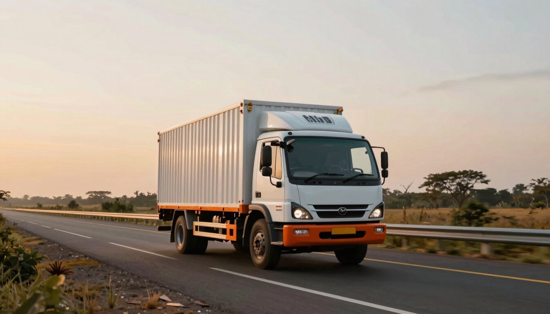 A high-end, clean white and orange logistics truck parked on a wide street in a modern South Asian / Indian residential area during bright daylight. The vehicle looks well-maintained and professional.